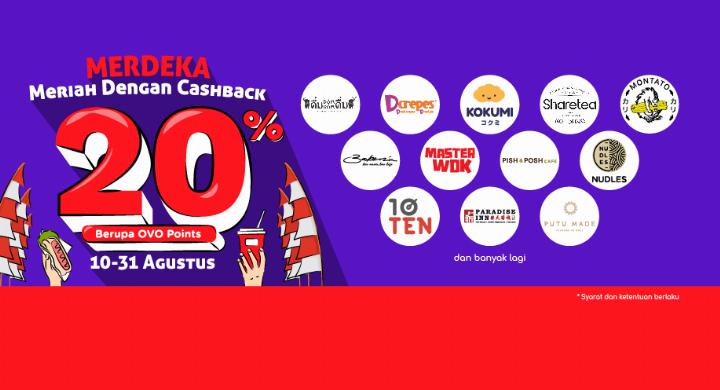 Di bulan Agustus ini, OVO juga punya promo MERDEKA (Meriah dengan Cashback) untuk kamu semua! Jadi pokoknya bulan ini kamu merdeka dari laper, karena kamu bisa dapet Cashback 20% lho! Kamu bisa ajak temen, gebetan, atau mantan buat makan di merchant partner OVO yang oke banget!