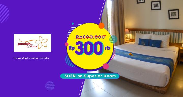 Nikmati penawaran special untuk menginap di Pondok Sari Hotel yang nyaman dan harga terjangkau di kamar Superior Room selama 3 hari 2 malam hanya Rp300.000 cukup #pakeOVOaja dari harga normal Rp600.000. Buruan beli di aplikasi OVO kamu!