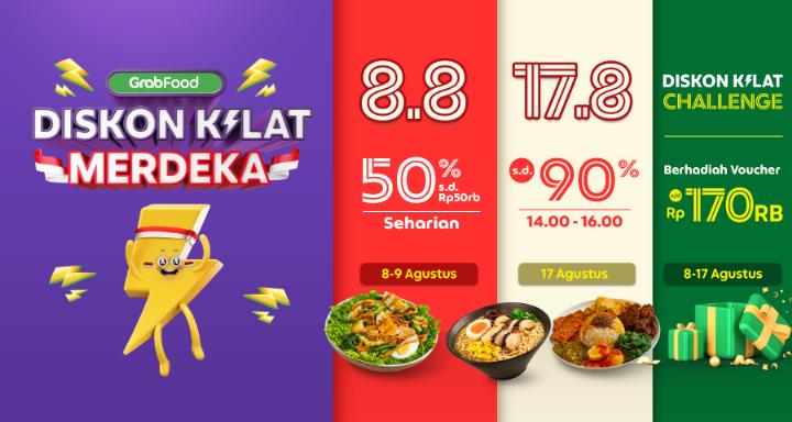OVO bersama GrabFood siap kasih kamu Diskon Kilat Merdeka untuk kulineran sepuasnya dari tanggal 8 - 9 dan 17 Agustus 2022. Kamu bisa raih Diskon s.d. 90% dari jam 14.00 - 16.00 WIB, plus ekstra diskon 50% seharian. Semua diskonnya bisa digabung dengan GRATIS ONGKIR dari paket GrabUnlimited.