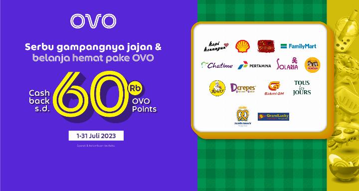 Karena selama bulan Juli, kamu bisa jajan dan belanja ekstra hemat di banyak merchant favorit dan raih cashback hingga 60.000 OVO Points lho!