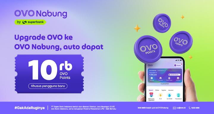 Buat kamu yang baru pertama kali upgrade ke OVO Nabung, ada kabar gembira nih! Cukup upgrade akun OVO kamu sekarang, dan kamu akan langsung dapetin 10rb OVO Points yang bisa dipakai untuk berbagai transaksi seru. Promo 10rb ini khusus untuk pengguna baru OVO Nabung yang melakukan upgrade tercepat setiap harinya, dengan kuota terbatas 2.000 orang pertama per hari. Tenang, kamu juga tetap bisa menikmati cashback promo pengguna baru lainnya, lho!