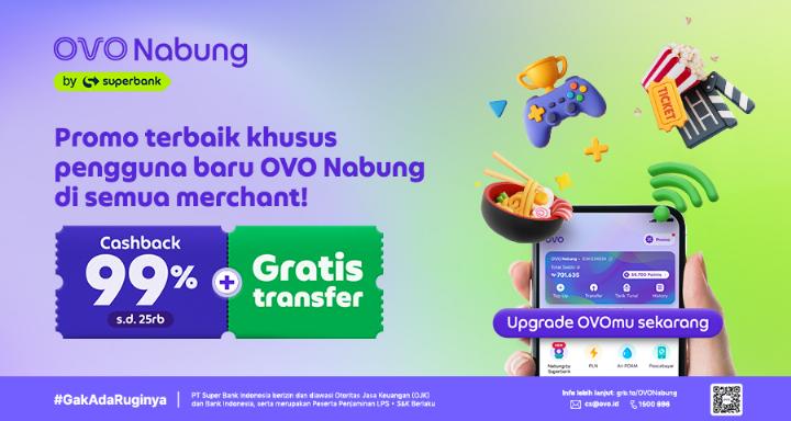 Nggak cuma itu, khusus pengguna baru OVO Nabung bisa pilih salah satu welcome promo 99% s.d. 25rb min. Transaksi 10rb dari berbagai merchant, check detailnya disini: