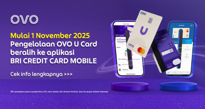 Untuk meningkatkan pengalamanmu bertransaksi menggunakan OVO U Card, mulai 1 November 2025 pengelolaan OVO U Card akan beralih ke aplikasi BRI CREDIT CARD MOBILE.
