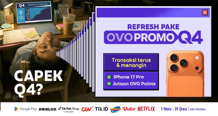 Biar gak capek-capek amat, yuk nikmati berbagai promo Q4 OVO. Ada hadiah iPhone 17 pro & jutaan OVO Points juga lho.