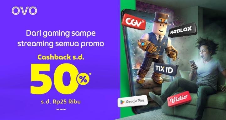 - Cashback 50% hingga 25.000 OVO Points minimum transaksi Rp20.000 menggunakan OVO Cash. Promo berlaku untuk transaksi ROBLOX, Free Fire, Free Fire MAX, Higgs Games Is, Mobile Legends, eFootball 2024. Periode 1 - 30 April 2026.
