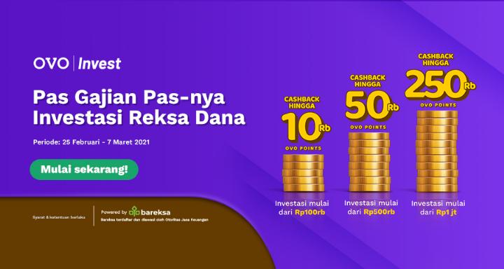 Pas banget nih! Mulai tanggal 25 Februari - 7 Maret 2021, OVO punya promo spesial buat kamu para investor! Kamu bisa langsung investasi Reksa Dana sebanyak-banyaknya di aplikasi OVO, dan dapetin Cashback hingga 25O.000 OVO Points!