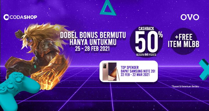 Beli voucher game di Codashop pake OVO emang top! Selain dapet cashback 50%, dapet free item MLBB pula.
