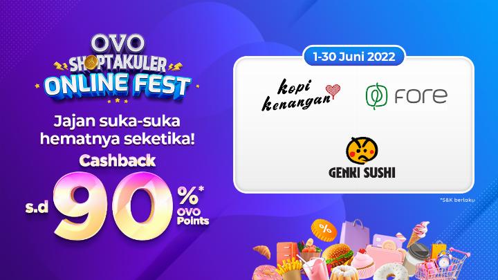 - Cashback 20% hingga 50.000 OVO Points/transaksi/user/period dengan minimum transaksi Rp250.000 menggunakan OVO Cash. Periode: 21- 30 Juni 2022