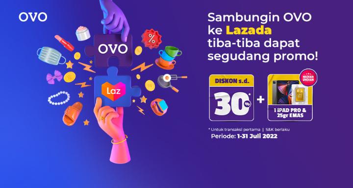 Yuk sambungin OVO kamu ke Lazada! Prosesnya cepat & gak ribet, ditambah lagi kamu bisa dapet segudang promo yang menarik banget! Yes yes, nikmati Diskon s.d. 30% spesial buat kamu pas checkout di Lazada pake OVO. Masih kurang? Ada total hadiah undian berupa 1 iPad Pro & lebih dari 25 gram emas juga lho buat kamu! Belanja online jadi puas tanpa boros!