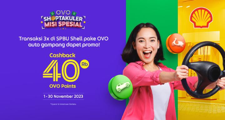 - Pengguna yang melakukan transaksi di SPBU Shell dengan minimum transaksi Rp 40.000 menggunakan ovo cash akan mendapatkan Cashback 8% maksimal 10.000 OVO Points. Periode 1-31 Oktober 2023
