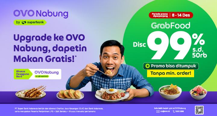Upgrade OVO-mu ke OVO Nabung di tanggal 8-14 Desember 2025 dan dapet diskon GrabFood 99% s.d. 50rb tanpa minimum order. Promonya bisa ditumpuk dan berlaku untuk semua merchant GrabFood lho!
