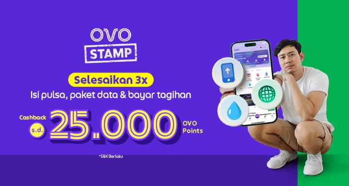 - Pengguna yang melakukan 3x transaksi isi pulsa, isi paket Data, dan bayar tagihan PDAM dengan minimum transaksi Rp25.000 dalam rentang 2 bulan (Maret - April) akan mendapatkan reward OVO Points sebesar 25rb.